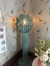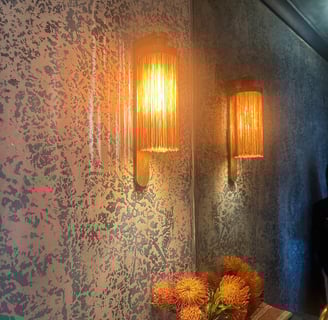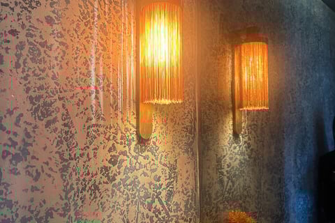 There was a small bathroom off of the bar area. It was wonderfully lit and had a beautiful green tile sink. The warm orange lighting against the blue floral wallpaper was such a wonderful moment.
