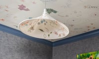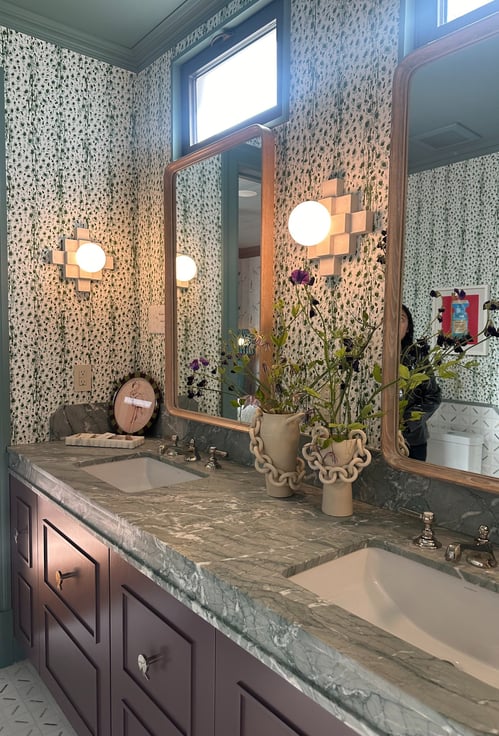 On the third floor, there were two kids' bedrooms (designed by L+P interiors) that shared a bathroom. The bathroom's cabinet was a deep and moody mauve color, while the countertop was a green-gray marble. The trim a medium toned blue-green that tied in the space so effortlessly. The variations of greens and purples were such a magnificent choice, as it gave a very youthful feel that was timeless and not overpowering nor intense.