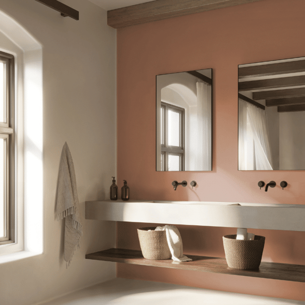 Dunn Edwards' color of the year for 2025 is Caramelized DET 687. It is a warm terracotta brown that has a medium--medium-deep depth. It is a very earthy, organic and nostalgic color. It is a historic color and while many want to get away from that outdated or darker terracotta look, I believe that in communal spaces Caramelized would look delightful. Although this color would look pleasant in a well lit bathroom, as kitchen or bathroom cabinets and even a nursery, I also trust that Caramelized would absolutely thrive in a commercial exterior space alongside; forest greens, creamy whites, dark charcoal colors and dark espresso tones. If you are wanting to transform your space into a more vintage feel, this color is perfect for that as it has those orange undertones to create that sort of feel. However, if you're looking for a warm brown to modernize your space, this can be an exceptional color as it would look great on furniture against lighter colored walls.